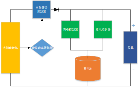 峰值功率跟踪(MPPT)方式中,有一个峰值功率跟踪器,时刻监测太阳电池阵的输出功率,当蓄电池没有充满时,峰值功率跟踪器控制串联开关调节器,使太阳电池阵工作工作在最大功率点;当蓄电池已经充满后,峰值功率跟踪器调节太阳电池阵功率点,让太阳电池阵输出的能量恰好与负载消耗的能量相同。