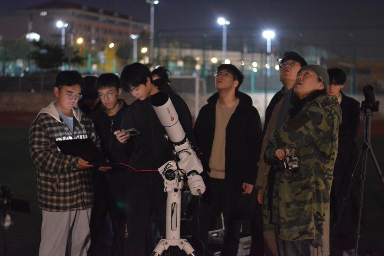晚上七时三十分,天文协会会长杜赫带领新成员,携望远镜等设备抵达校区东操场。组装设备时,杜赫为新干事讲解设备原理与功能,指导他们完成线缆连接、赤道仪配平等操作,完成初次培训。半个多小时后,天协架起一台望远镜和一台长焦相机,开启路边天文活动。操场锻炼、散步及往返教学楼和宿舍的师生,被明亮圆月与专业设备吸引,不少人首次通过望远镜看清月亮,现场惊叹声此起彼伏。