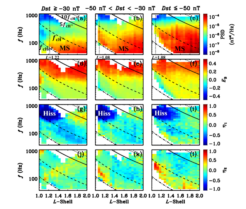 快磁声波是分布于地球磁层赤道面附近的低频哨声模波动,能够与辐射带电子发生朗道共振,弹跳共振以及渡越时间散射等相互作用,进而影响辐射带电子的动力学演化。以往对该波动的统计研究主要集中在L > 2(L为磁力线磁壳数,以地球半径为单位)的区域。然而,最近的观测和模拟研究显示,由于快磁声波具有跨磁力线传播的特性,其在L < 2的近地区域同样可以被观测到。当快磁声波传播至L < 2区域时,由于局地磁场强度较强,波频率可能处在局地质子回旋频率以下,从而引起快磁声波极性反转、反射、模式转换等一系列物理过程。