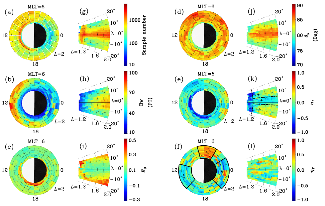 朱辉教授带领课题组成员,依托范艾伦探测器2012-2018年期间高精度的观测数据,构建了L < 2区域完备的快磁声波特征数据库。通过多维度统计分析,揭示了该区域快磁声波的空间分布,并证实了快磁声波在L < 2区域处主要沿方位角传播,这导致了其在磁当地时上更广阔的分布范围。分析进一步表明,在L < 2区域,快磁声波的功率谱存在径向上的内边界和频率上的下边界。研究团队基于冷等离子体色散关系理论,阐明了这两个边界的形成机制及其与局地离子组成和波频率的动态关联。